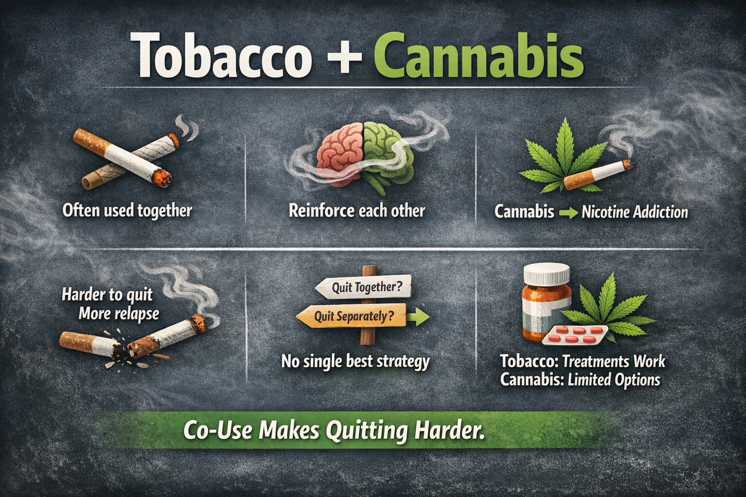One of the most challenging realities is that cannabis use complicates smoking cessation. People who use both substances tend to experience more intense withdrawal symptoms during tobacco quit attempts, at least in the early stages (6).