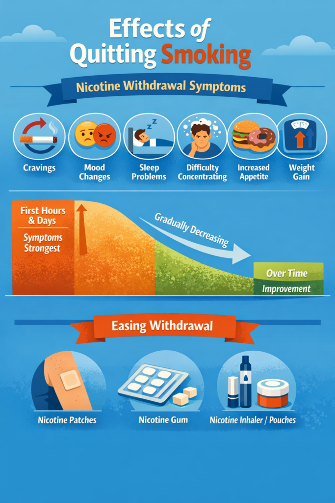 Quitting smoking causes nicotine withdrawal: cravings, mood changes (irritability, sadness, anxiety), sleep problems, difficulty concentrating, increased appetite and weight gain. Withdrawal symptoms can be eased with nicotine replacement therapies or other non-combustible nicotine sources.