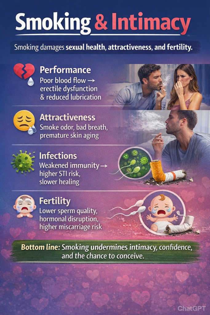 Long associated with an image of freedom, sophistication, or rebellion, the cigarette hides a reality far less glamorous when it comes to sexuality and intimacy. Beyond the well-known cardiovascular and respiratory risks, smoking has direct and insidious repercussions on sexual life, attractiveness, and even the ability to procreate. It is a complex story where the smoke does more than just drift away.