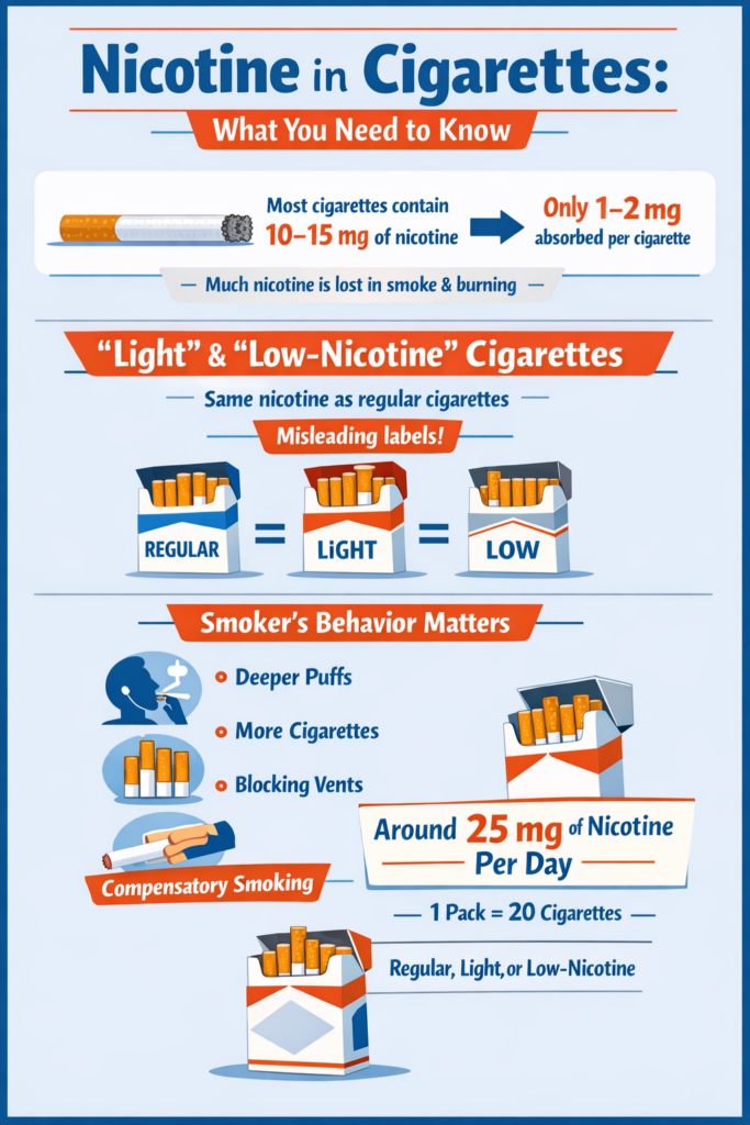 This means that a heavy smoker can easily absorb 25 mg of nicotine per day by smoking a pack of 20 cigarettes, whether these are regular, low-nicotine or light cigarettes.